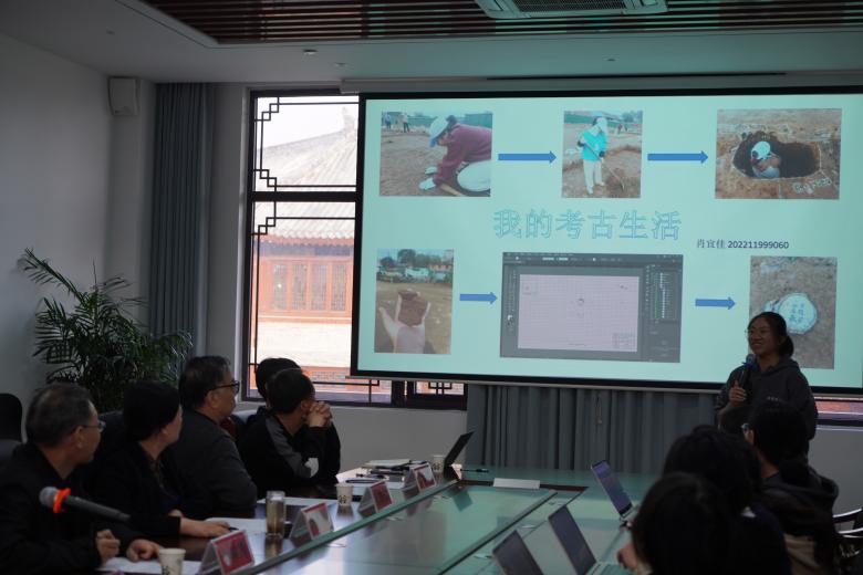 随后,2023级考古学专业的十位本科生依次就实习以来的收获与感受进行汇报。肖宜佳在60天的田野考古完成了从理论到实践的跨越,不仅掌握了核心考古技能,更在与文物的直接接触中感受到历史的温度,日后将继续深化理论与实践相结合,为考古事业贡献自己的力量。陈露瑶在汇报中分享了其探方的特殊发现与实践收获。通过亲手接触精美的出土文物,她深切体会到与历史对话的真实感。在技术实践方面,她掌握了CAD建模、无人机拍摄等测绘技能,这些经历让她不仅提升了田野考古专业能力,更全面感受到考古工作的独特魅力。