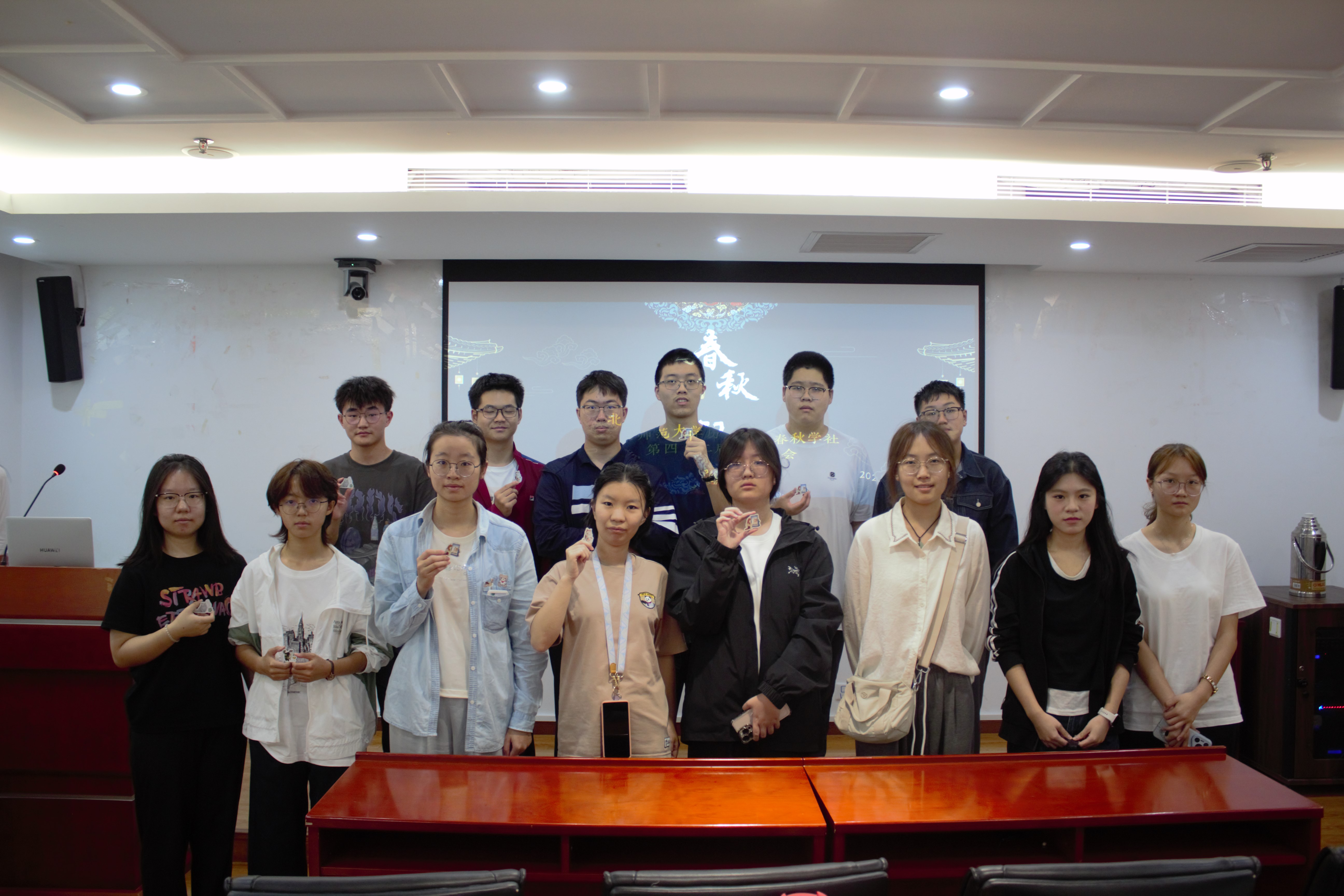 参会嘉宾与社员合影留念后,大会进入了紧张的抽奖环节。多位同学获得了学社准备的精美文创与书籍,现场气氛热烈。此外,春秋学社也发放了2024-2025学年《年鉴》。