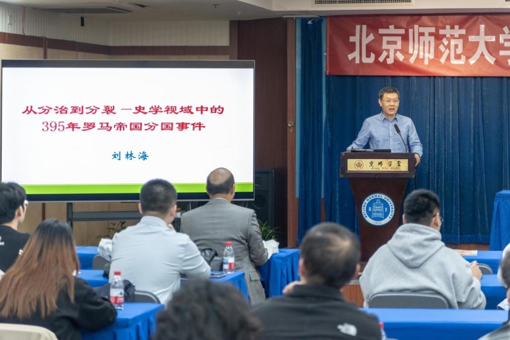 接下来,北京师范大学历史学院院长刘林海教授为参会同学带来了题为“从分治到分裂——史学视域中的395年罗马帝国分国事件”的主题讲座。刘林海院长以“395年罗马帝国是否分裂”这一常识性问题为核心,以时间线为轴展示了伯里、鲁滨逊、桑德伯格等学者的质疑与“主动分治”观点的提出。在学者对“分裂说”驳斥的基础上,回顾了爱德华·吉本和乔治·芬利等学者如何在民族主义史学视角下构建“395年罗马帝国的分裂”,及其成为大众常识的过程。通过总结罗马帝国分裂在不同时代下解释各异的原因,及中国传统的统一与分裂观念对异域的395年罗马分国事件理解的影响,深入剖析历史常识形成、质疑与再思考的过程,突出了批判反思精神在历史学习与研究中的重要性。讲座条理清晰、层层深入。刘林海教授强调了时代和研究视角对史学家的影响,勉励同学们在中国日益强大的新时代下,扎根基础、提高素养、破除思维定势,以实力应对挑战,推进史学发展与民族复兴。
