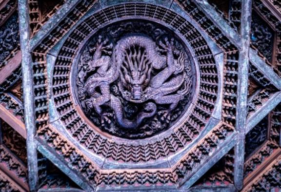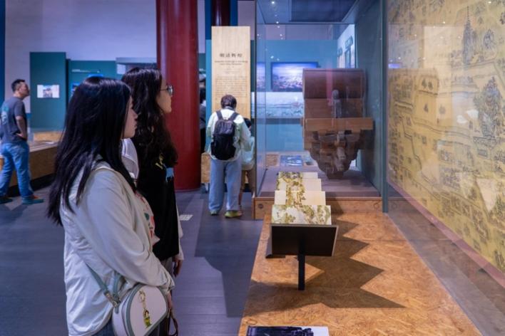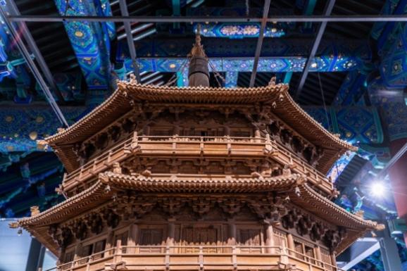 穿过宽阔的院落,走入太岁殿,被誉为“稀世国宝”的“北京隆福寺藻井”气势恢宏。藻井是我国传统建筑中的一种顶棚装饰,代表着小木作装修技术的高峰。隆福寺藻井分为六层,云纹图案金碧辉煌,宫阙装饰美轮美奂,二十八星宿神像更是栩栩如生。“中国古代建筑营造技艺”带领观者从细节处理解中国古代建筑。从形态各异的屋顶、层层叠叠的斗拱,到寓意丰富的脊兽、精雕细琢的望柱,众多模型和实物展品,令观者折服于中国古代建筑的多样设计、巧妙架构与精致装饰,并且得以更加深刻地认识古人高超的建筑技艺与智慧。这些建筑瑰宝,是中国古代建筑艺术的璀璨明珠,更是中华文化的生动注脚。