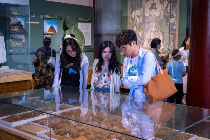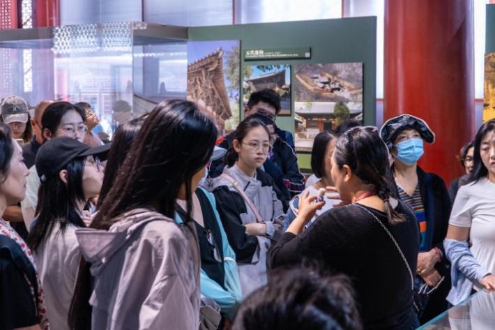 走入拜殿,伴随着细致的讲解,学社成员们参观了“中国古代建筑发展史”陈列。展厅内大量的实景图片、精美模型和珍贵实物,展现了中国古代建筑从原始社会的茅茨土阶,到明清时代的皇家宫殿的变迁历程。无论是汉代之古朴、唐代之气派,还是宋元民族交融的包容,抑或是明清宫墙高筑的森严,都令人深感我国古代建筑之历史悠久、成就辉煌。学社成员们在聆听讲解的过程中,深入各项展品,回溯过往史事,将建筑工艺、理念和形制的发展线索,与时代经济、政治、文化的历史背景紧密结合,不仅深化了对古代建筑文化的认识,也直观感受到了古代建筑经久不衰的魅力。