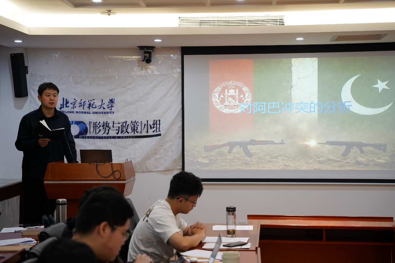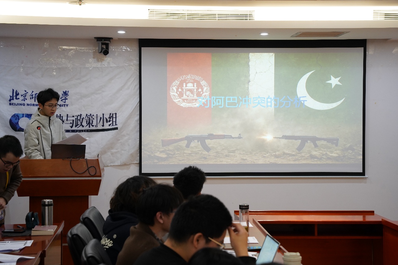 小组2025级院系联络员唐古拉风以《阿富汗与巴基斯坦冲突》为题,针对2月巴基斯坦与阿富汗的边境冲突,从冲突情况、冲突原因和冲突影响三个方面详细阐述了两国冲突的来龙去脉。北京大学国际关系学院博士研究生王胤兆做出点评。他对分享同学精辟独到的个人见解表示认同,进一步讨论了边界问题、族群政治和域外大国因素对于地缘政治的影响,并建议同学们关注中国在国际事件中的角色与影响。