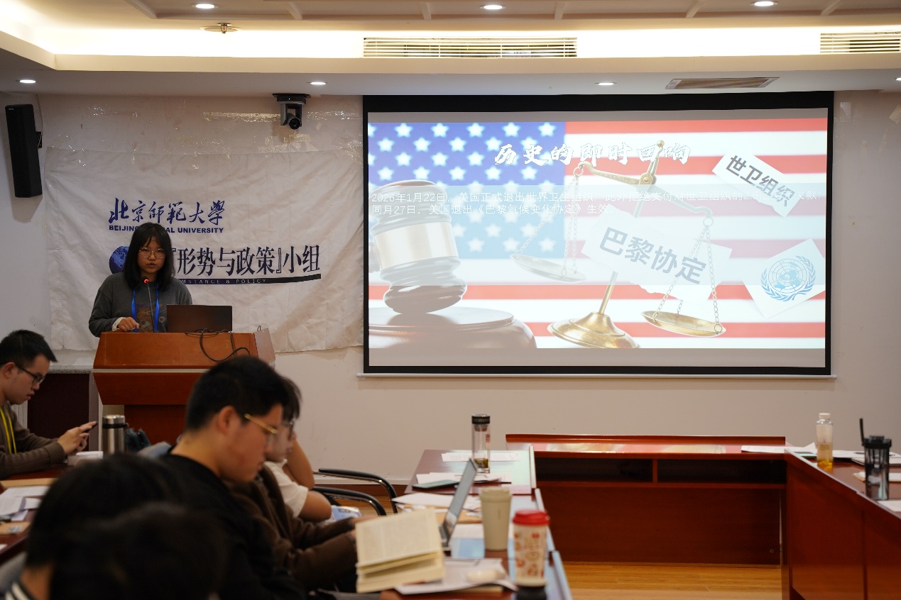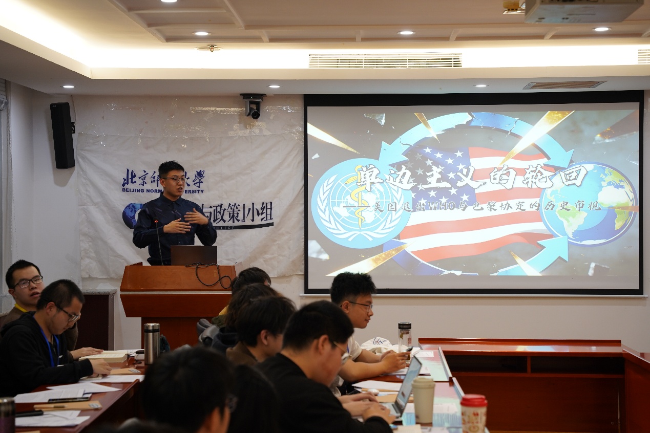 小组2025级观察员陈鑫玥则以《美国单边主义的轮回》为题,概述近期美国相继退出WHO与巴黎协定背后的多元因素,从美国的外交历史轮回,指出美国周期性摇摆于领导与孤立主义之间的特点。王树涛在点评中以近期特朗普政府对伊朗的军事行动缺乏明确战略目标为例,肯定了她提出的“内部政治外部化”的看法,并点出特朗普政府的民粹主义政策迎合短期选民情绪而非长期国家利益的特点。