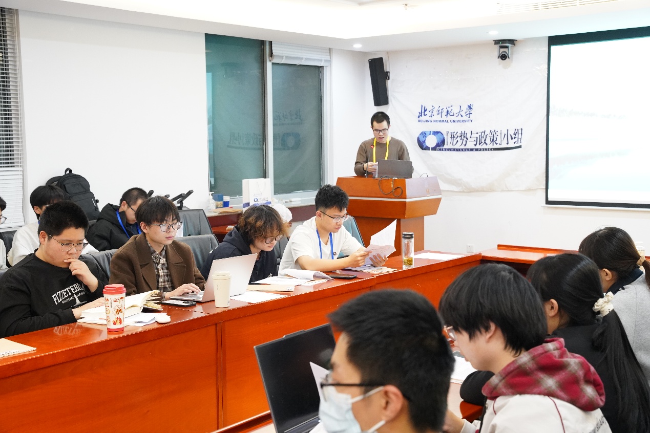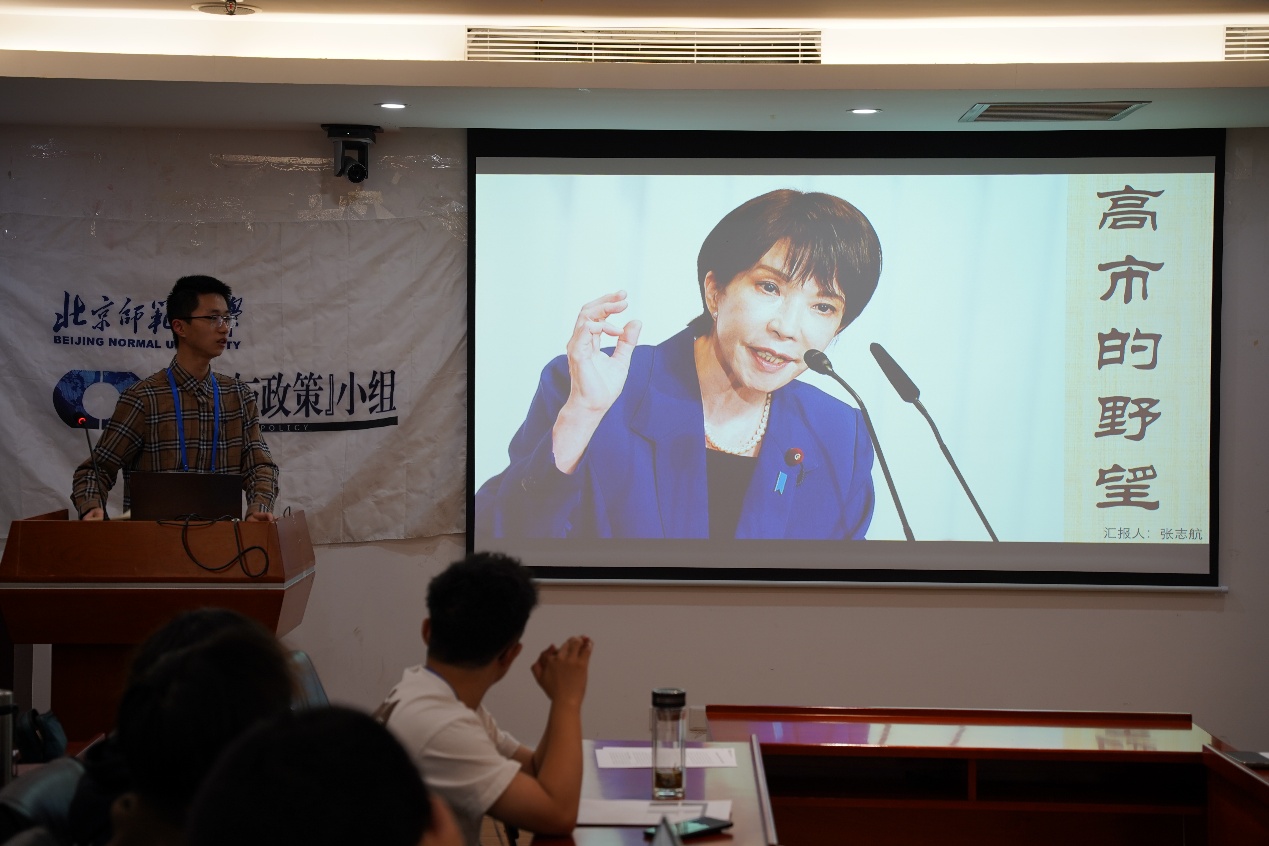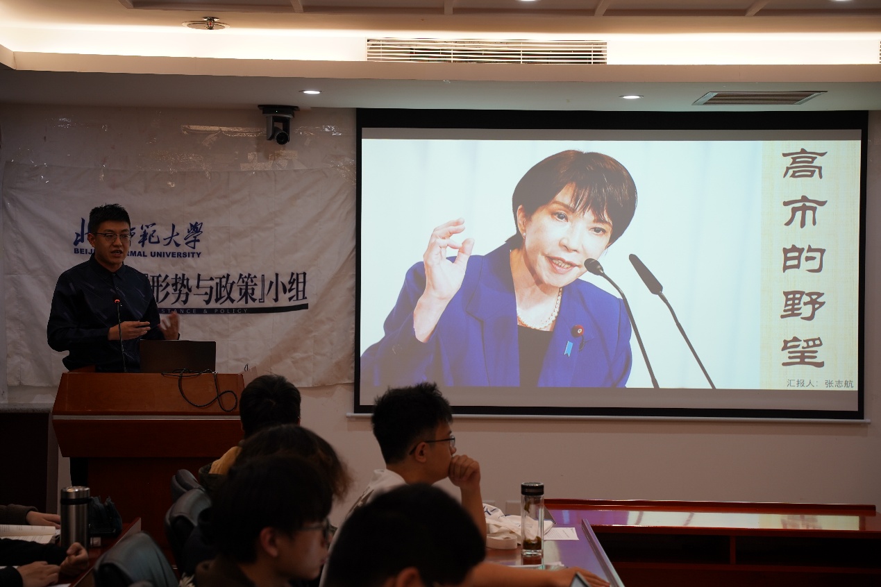 小组2025级组员张志航以《高市的野望》为题,对近期日本高市早苗政府相关政策动向展开分析,从日本众议院选举结果、首相指名选举结果以及日本政府政策三大方向揭示日本政局发展情况。北京师范大学历史学院硕士研究生王树涛做出点评。他回顾了2024年以来日本政坛发展历史,指出了日本社会的政治现状,并进一步强调了现行政策与日本国内政治心态的矛盾。