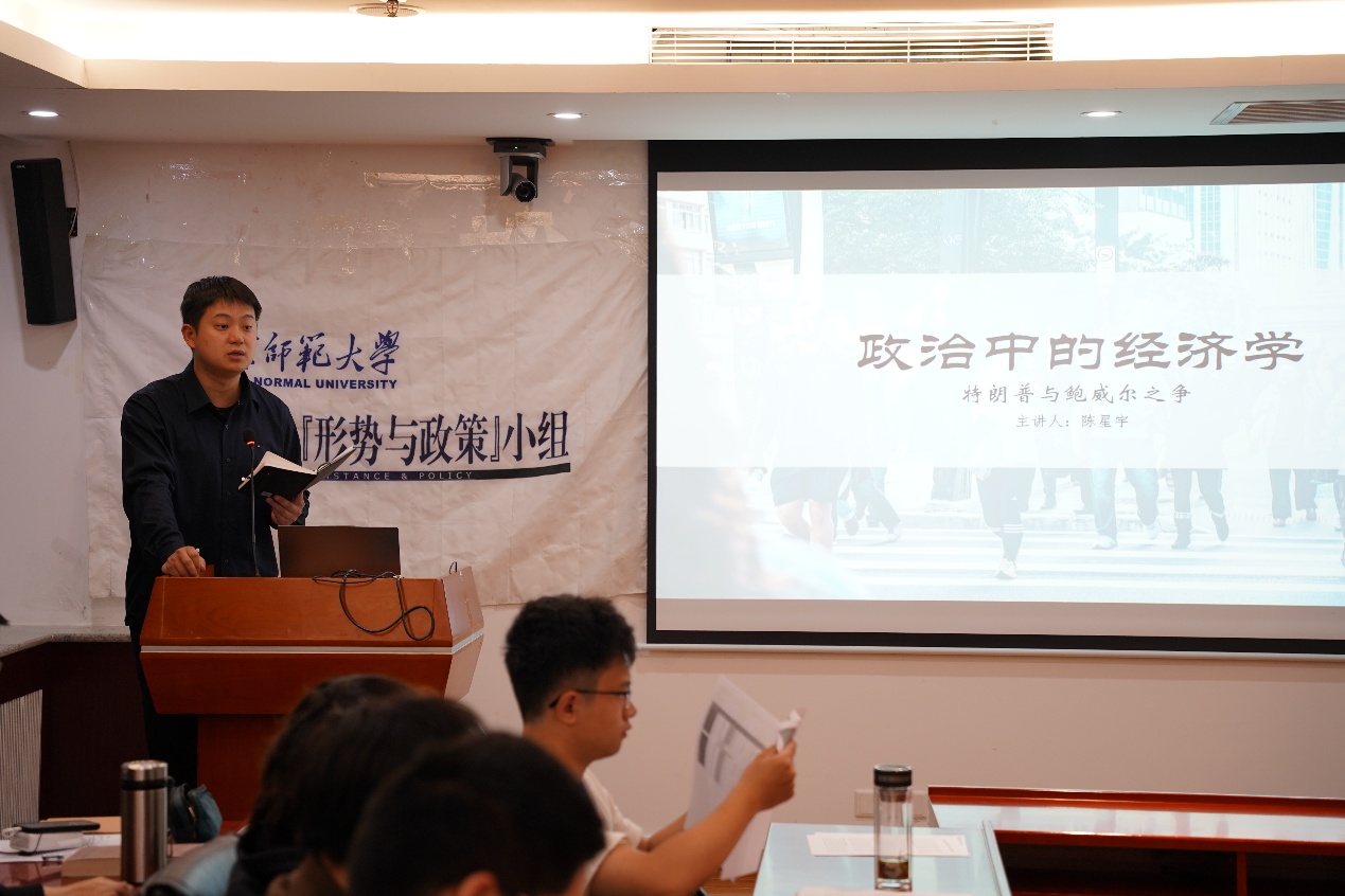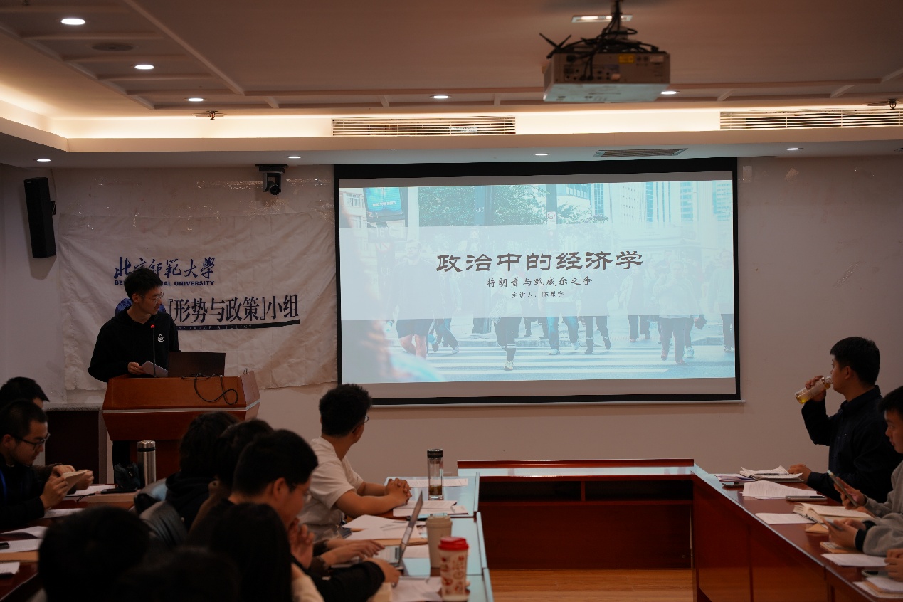 小组2025级观察员陈星宇根据特朗普2025年上台以来的经济政策,作题为《政治中的经济学:特朗普与鲍威尔之争》的分享,借助经济学知识与数据分析方法,就美联储政策分歧与经济数据争议两个方面解释总统与美联储的矛盾,涉及制度制衡、市场波动和人事任命等关键点。王胤兆高度赞扬他运用多种方式深入浅出地讲解了美联储与总统的博弈,借用“美国反对美国”的观点强调了这一事件中政治经济双重维度的重要性,并提醒同学们注意美国市场波动中的通货膨胀因素。