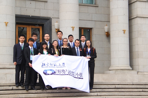 离开使馆前,我院“形势与政策”小组外联专员郑子薇同学代表北京师范大学向俄罗斯驻华大使杰尼索夫赠送了精心准备的师大特色纪念品,并与大使先生合影留念。