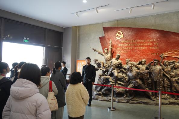 8日下午,师生先后参观沂南县沂蒙红嫂纪念馆、歌曲《跟着共产党走》诞生地东高庄村。在讲解员的带领下,师生深入了解学习抗日战争期间以明德英、王焕于、张淑贞等为代表的“沂蒙红嫂”救护伤员、支援前线,抚养革命后代等可歌可泣的革命事迹。在东高庄村的沉浸式展演厅中,师生了解到山东妇女救国联合会常委陈若克同志为抗日牺牲的英勇事迹以及抗大文工团石峰同志为抗日毅然献出年轻的生命的故事。