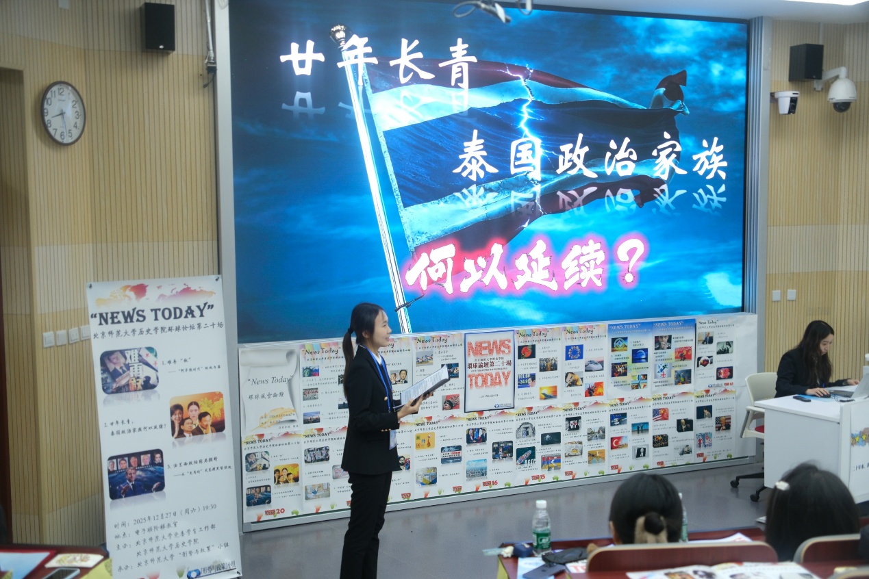 本次活动恰逢“News Today”北京师范大学历史学院环球论坛二十周年。活动伊始,主持人通过丰富的图片资料带领大家重温二十年来环球论坛精彩、难忘的瞬间。活动中,“形势与政策”小组2025级新成员分为三组,围绕叙利亚阿萨德政权、泰国他信•西那瓦家族、法国总理更迭等国际热点话题,结合历史与现实进行主题展示。