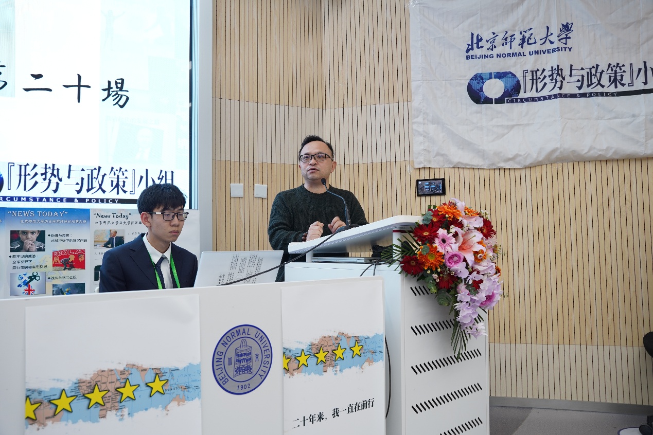 刘林海教授在讲话中肯定了同学们的选题设计、思考深度和丰富的呈现形式。他表示,环球论坛活动充分展现了北师大历史学院学子的视野与风采,不仅有助于在学术选题上引导学生从宏观角度进一步认识世界,还能促进学院师生共同参与和探索时事研究和专业学习之间的融通与互动。他鼓励“形势与政策”小组成员从长时段的研究视角出发,挖掘历史发展的深层动因,并将理论学习与生活实际相结合、在时事研究中提升专业水平。